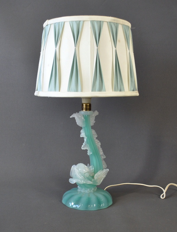 Aqua & white glass dolphin with tail supporting lamp holder & shade.