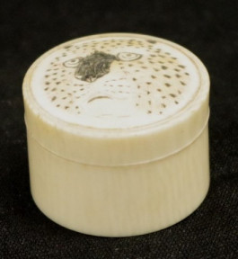 carved tiger's head decoration to lid, of circular pill box (diameter 3cm approx). -