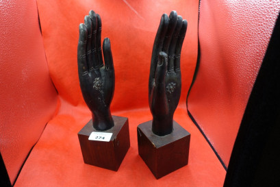 Lot Description:Pair of early Thai bronze Buddha hands on rosewood bases