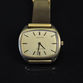 Rectangular electroplated gold case with R/G German band. Running, unserviced. -