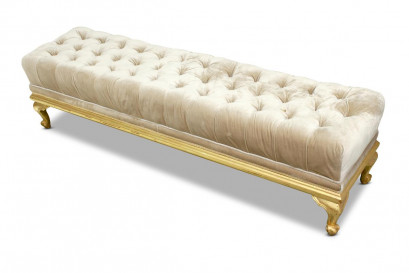 of narrow rectangular form, with buttoned top, and cabriole legs accented in gilt, l 155cm -