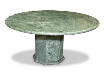 set with a green marble top, raised on facetted pedestal support, 75cm, d 164cm -