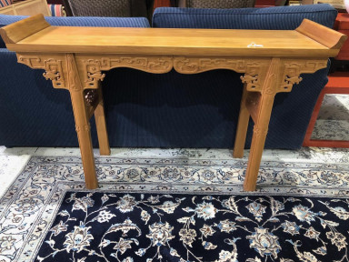 with narrow rectangular top, above carved and pierced frieze on four legs, 99cm x 144cm -
