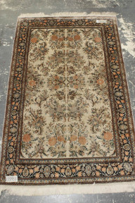 of rectangular form, decorated with central panel displaying flowers, surrounded by floral border, in tones of blue, orange and blue, 205cm x 121cm -