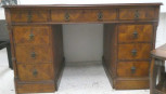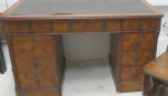 makers mark stamped into top of drawer, the pedestal desk with three banks of long deep drawers and two single drawers flanking centre drawer with inlaid brown leather top and original handles measures 122cm x 65cm x 71cm H -