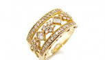 set in open work shields in a split tapering band, tests as, stamped PV TDANH on inner band,approx weight 4.4 approx, ring size O. tests as 14ct -