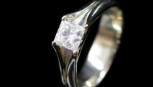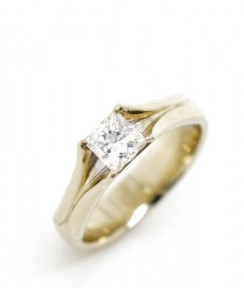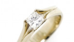 marked 750. Approx princess cut diamond size 0.57ct, colour F, Clarity Si1. Also with single 0.02ct diamond set to inside of shank, ring weight 6.2 grams, ring size L -