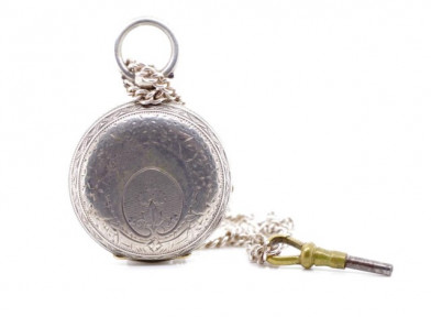 on a silver chain. With a key wind movement. Damage to the enamel dial. Watch working when tested. Approx case diameter 40mm, chain length 60cm -
