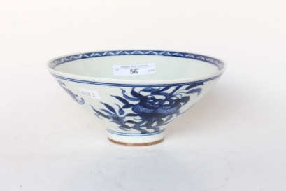 with peach branches and flying bats decoration, 6 x blue character marks to underside, 17cm D, 7.5cm T