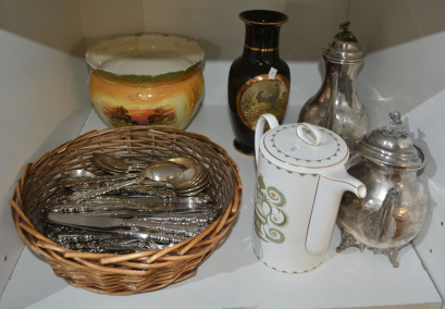 Chokin vase, qty of early cutlery, chamber pot and a Susie Cooper retro coffee pot -