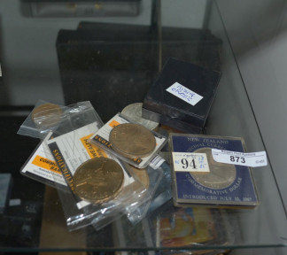 $5.00 commemorative coins, world coins NZ commemorative $1.00 coin, and a Russian crosz -