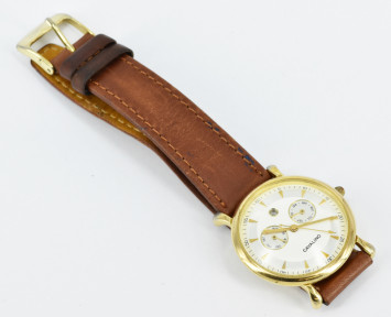 guilloche dial, with date and two sub-dials, working, stainless steel case and leather band. -