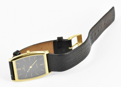 black dial, gold finish case on stainless steel, leather band, quartz movement, working. -