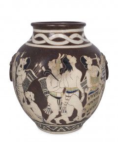 Lot Description:A Japanese Art Deco pottery vase with sgraffito Aztec Indian scene, circa 1930