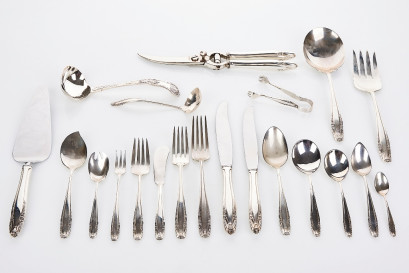 comprising twelve oyster forks, twelve salad forks, twelve entree forks, twelve entree knives, eleven bouillon spoons, twelve soup spoons, twelve table forks, twelve table knives, twelve dessert forks, twelve dessert spoons, twelve orange spoons, twelve teaspoons, eleven butter knives, twelve coffee spoons, meat scissors and sixteen serving pieces (195)