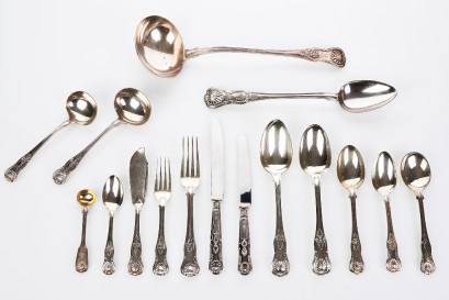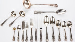 setting for twelve and more, comprising twenty-four entree forks, twenty-four entrée knives, twenty-four table forks, twenty-four table knives, twelve table spoons, twelve fish forks, twelve fish knives, twelve bouillon spoons, twelve dessert forks, twelve dessert spoons, twelve teaspoons, twelve coffee spoons, and six serving pieces, hallmarked (QTY)