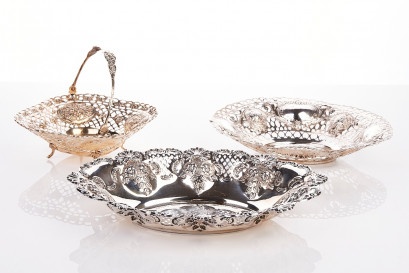 with repousse decoration of flowers and shells, hallmarked, together with two Continental white metal baskets (3)