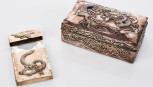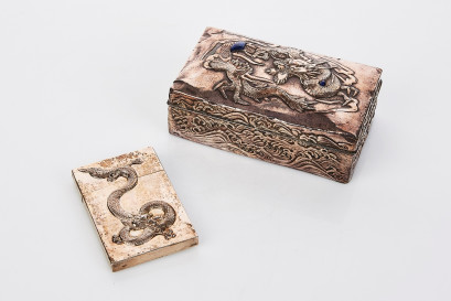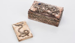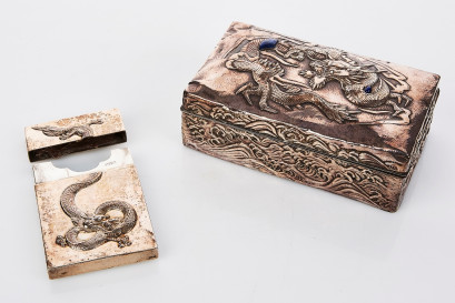 the cover chased in high relief with a dragon and inlaid with lapis lazuli, the sides decorated with waves, stamped 'silver', together with a chinese silver card case, mark of Wang Hing, Hong Kong, c. 1900, decorated wth a dragon, stamped '90 HW' (2)