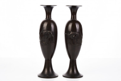 each of slender baluster form, cast in high relief with trumpeting elephants, signed '?? - Komei'(2)