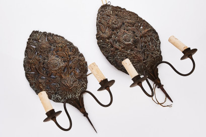 Lot Description:Pair of Anglo-Indian Brass Repousse Two-light Wall Sconces, 19th Century
