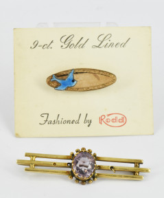 set with an amethyst, metal pin. Length 5.5cm. Weight 6.7g. Together with a gold lined brooch. (2) -