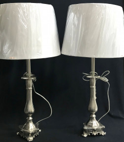 Lot Description:A Pair of Tall English Gothic Brass with Pewter Lamps with Shades