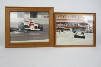 believed to be from the Adelaide Australian Grand Prix, comprising of McLaren and one other both glazed, framed, both photographs measure approx. 24 cm wide, 19cm high, McLaren picture with broken glaze. -