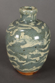 of ovoid form with a short neck, in a blue jun with white splash glaze, raised on a circular foot, h 21cm -