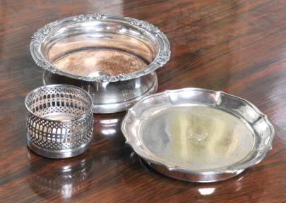 Lot Description:A Sheffield plate wine coaster, a cruet coaster and a sterling silver trivet