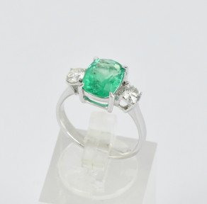 the oval cut emerald of 1.91ct, with two round brilliant cut diamond on shoulders of 0.48ct in total, on 18ct white gold. Size L. Weight 3.5g -