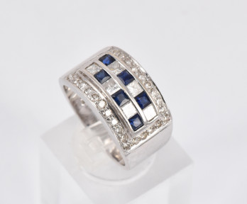 check pattern, the central panel set with six blue sapphire of square cut and six diamonds of square cut, surrounded by 30 round cut diamonds. Approx. weight of diamonds is 1ct. All set in 18ct white gold. Size O. Weight 9.7g. Signed by Ricco Ricco, and presented in a Ricco Ricco box. -