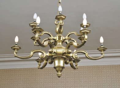 The faceted circular corona above a heavy linked chain supporting a lobed body with two tiers of six stems terminating in sconces, 155cm high. -