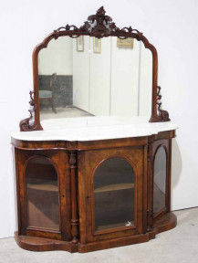 the mirrored back above a shaped marble top, with glazed cupboards below. Width: 137cm. -