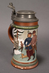 with cylindrical body, and pewter cover and thumb piece, above a continuous frieze of figures ice skating, in tones of brown and green, incised and impressed marks to foot, h 22.5cm -