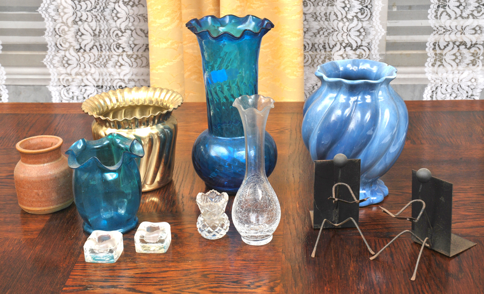 including two blue glass vases, a glazed ceramic vase, a copper jardiniere The largest vase 28.5cm high. -