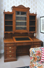 The rectangular back centred by a glazed door with shelves to either side, the lower section with a hinged leather inset writing slope above two frieze drawers and three drawers to either side with a Wellington type locking mechanism, with further cupboar -