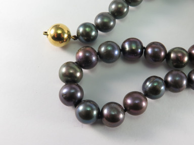 39 freshwater pearls (9.0-9.5mm) strung and knotted with a 9ct gold sphere clasp. Length of pearls 38cm. -