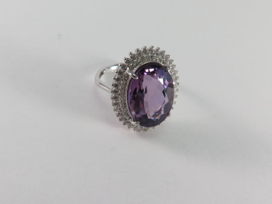 oval faceted amethyst in a double border of cubic zirconia; silver size-adjustable shank. -