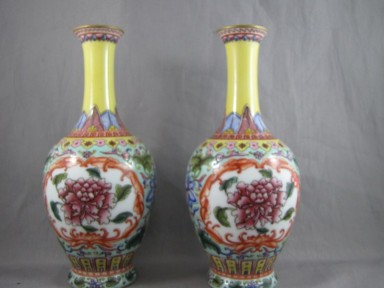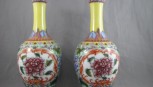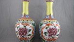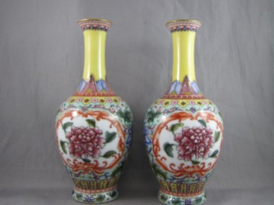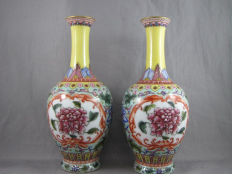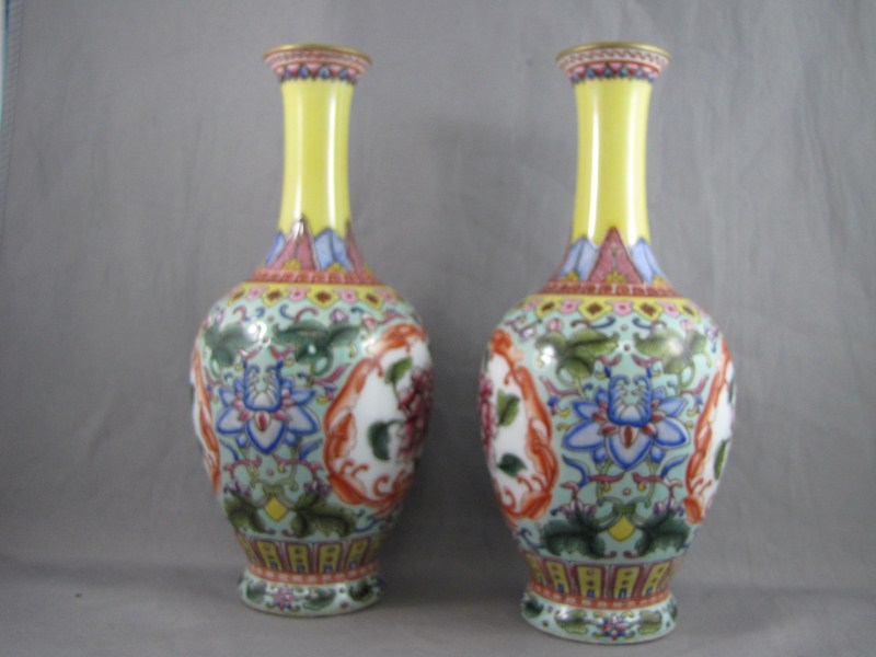 with waisted necks,above a tapering body, decorated with flowers, in tones of pink, surrounded by wufu on a turquoise ground in tones of yellow, green,and pink, seal marks to base, h 18cm -