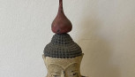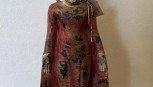 with flared red robes, bulbous flame. On a formica stand. Teakwood and pigment. 76cm high. -