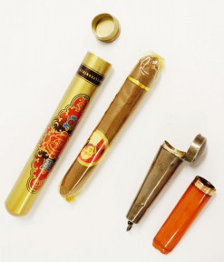 cigar case hallmarked for London 1924; together with enclosed 9 carat yellow gold rimmed amber cigar holder; and a Schimmelpenninck cigar in original metal case. -