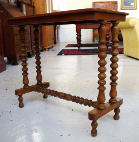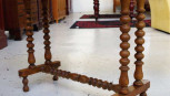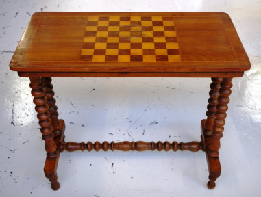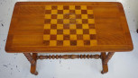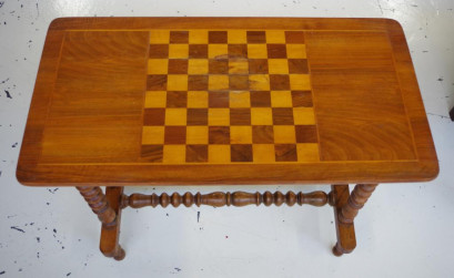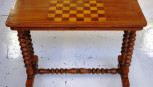 with inlaid chess board top supported by bobbin turned ends and stretcher, 78.5cm x 40cm, 67cm high approx -
