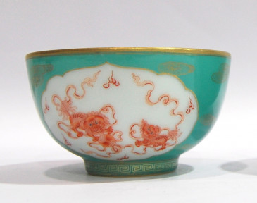 painted with lion dogs in cloud shaped cartouche on turquoise blue ground