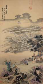 Lot Description:A Chinese Hanging Scroll with Scholar's Under a Pine Tree & Cranes Swooping, Signature & Cyclical Date 1926